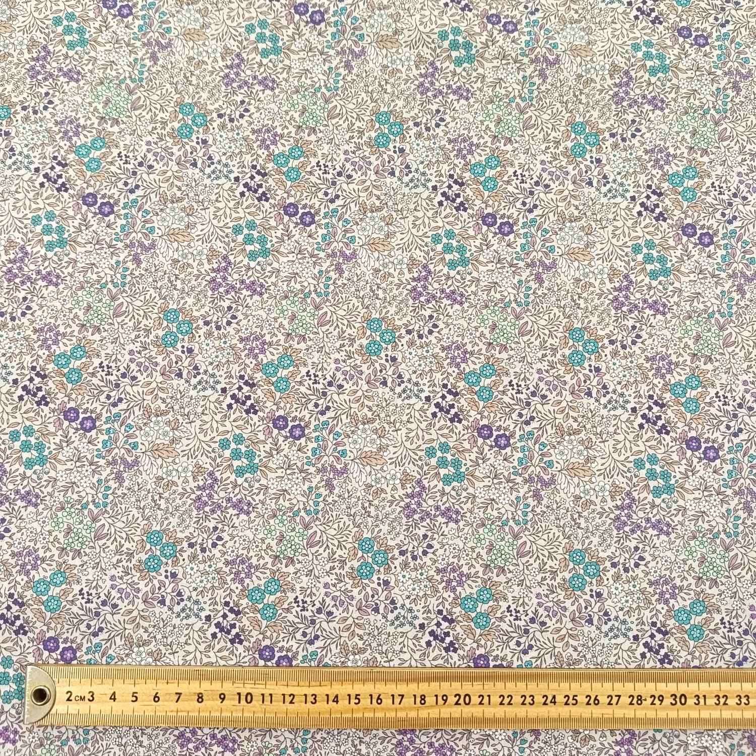 Este Algodón Floral Vintage es un tejido suave, cómodo y de excelente calidad, perfecto para confección y proyectos creativos que buscan un acabado delicado y atemporal. Presenta un estampado botánico muy detallado, con pequeñas flores y hojas distribuidas de forma armoniosa sobre un fondo claro.