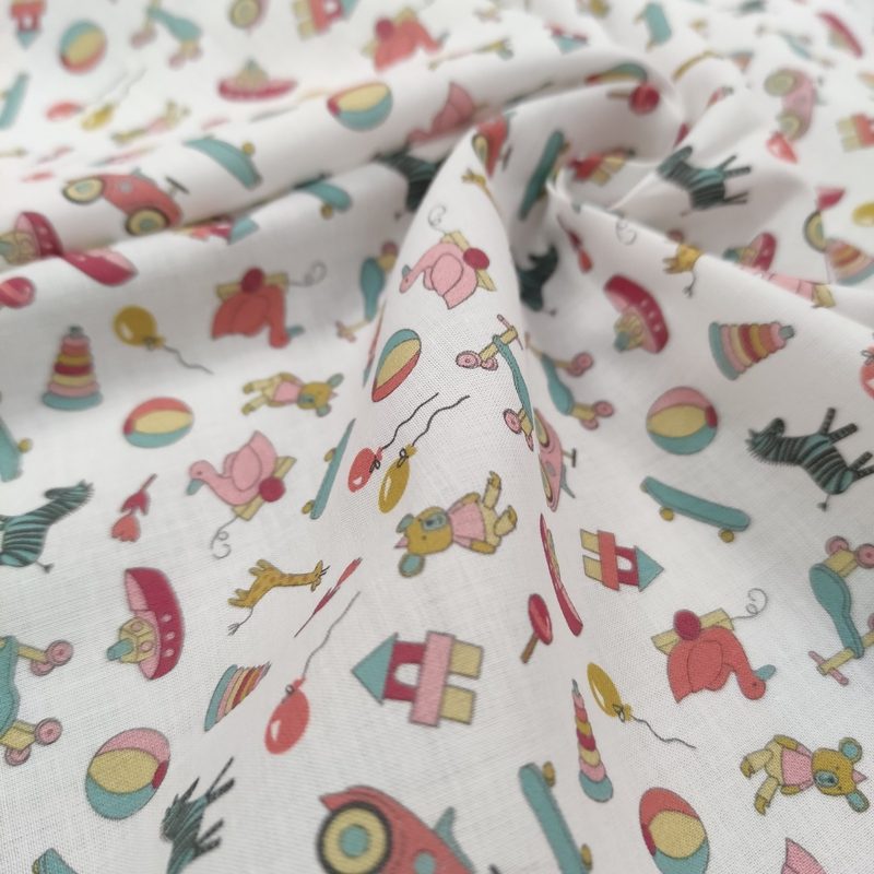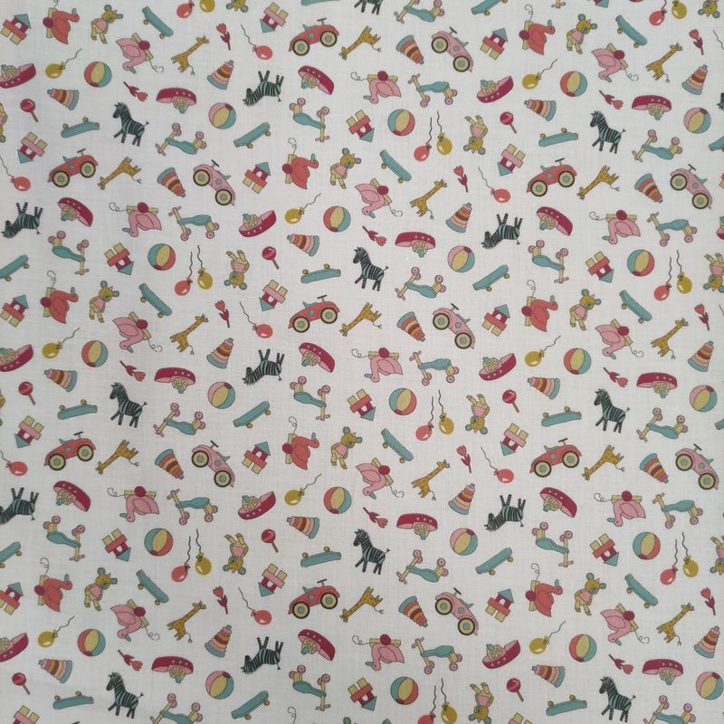 Estampado de pequeños juguetes sobre fondo blanco.