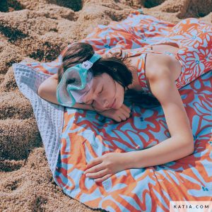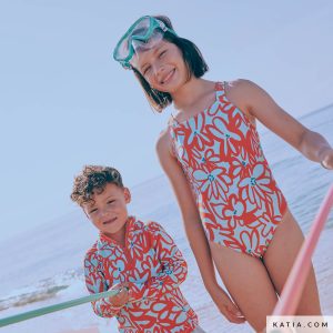 La licra Katia Hanami presenta un vibrante estampado de flores en tonos turquesa y naranja, es ideal para todo tipo de bañadores o bikinis, pareos, vestidos veraniegos, leggings, bodies y ropa deportiva.