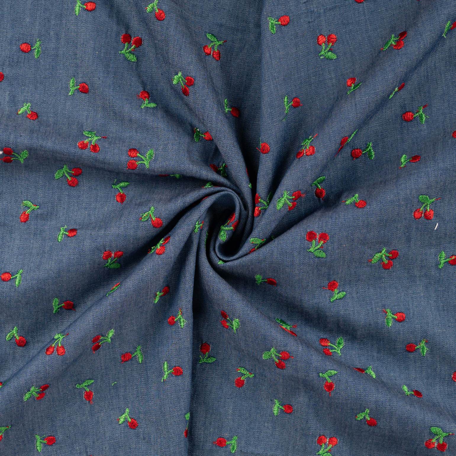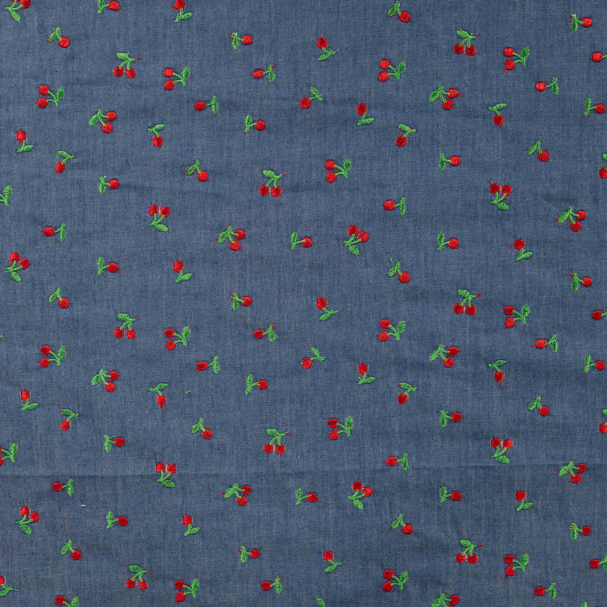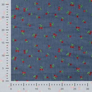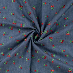 El Denim Bordado Cerezas es un tejido vaquero de algodón con un acabado resistente y elegante, decorado con pequeñas cerezas bordadas sobre la base azul clásica del denim. Combina la durabilidad y textura característica del algodón vaquero con un detalle decorativo que aporta frescura y estilo a cada prenda.