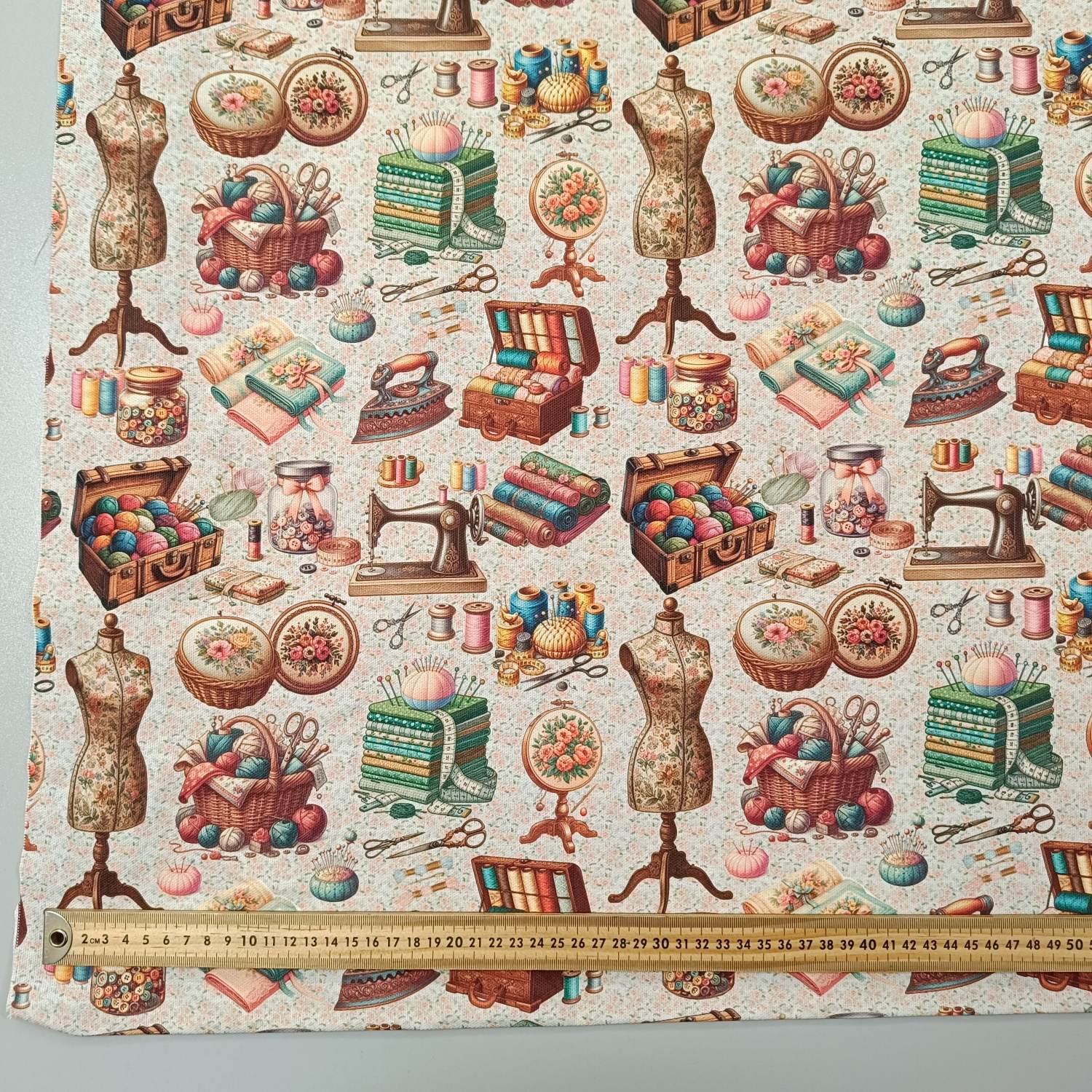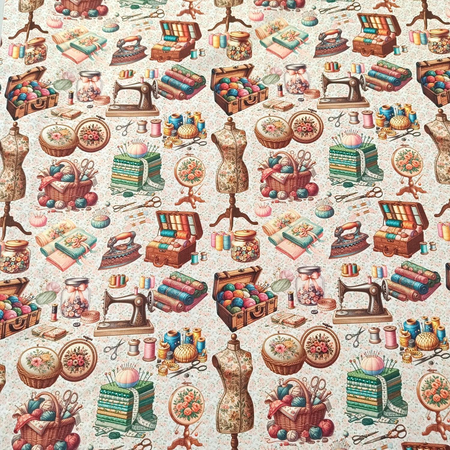 Loneta Cuarto de Costura  con estampado vintage de máquinas de coser, hilos y accesorios de labores, sobre un fondo claro con delicado microestampado floral. Ideal para bolsos de labores, fundas para máquina de coser, organizadores textiles, costureros, cojines decorativos, neceseres y todo tipo de proyectos DIY relacionados con la costura y las manualidades.