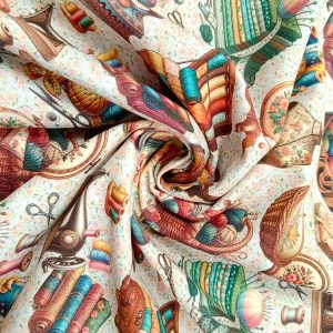 La Loneta Cuarto de Costura  con un detallado estampado temático inspirado en el universo de la costura y las labores sobre un fondo claro con delicado microestampado floral.