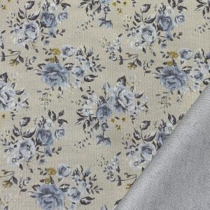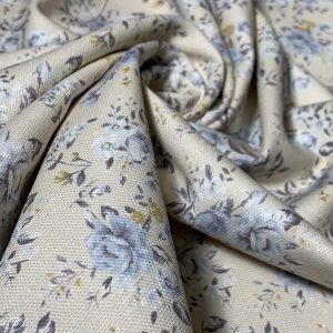 Loneta Half Panama de algodón con estampado floral en tonos azules sobre fondo beige.