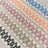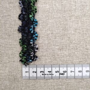 Pasamanería en forma de pequeñas ondas con flequitos de pelo en tonos azules, verdes y gris.