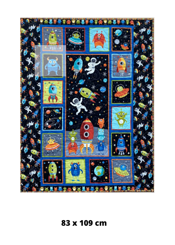 | Etiquetas | patchwork, quilt, quilting, decoración, algodón, panel, manta, colcha, espacio, monstruos, monstruo, nave, espacial, alien, alienígena, cohete, astronauta |