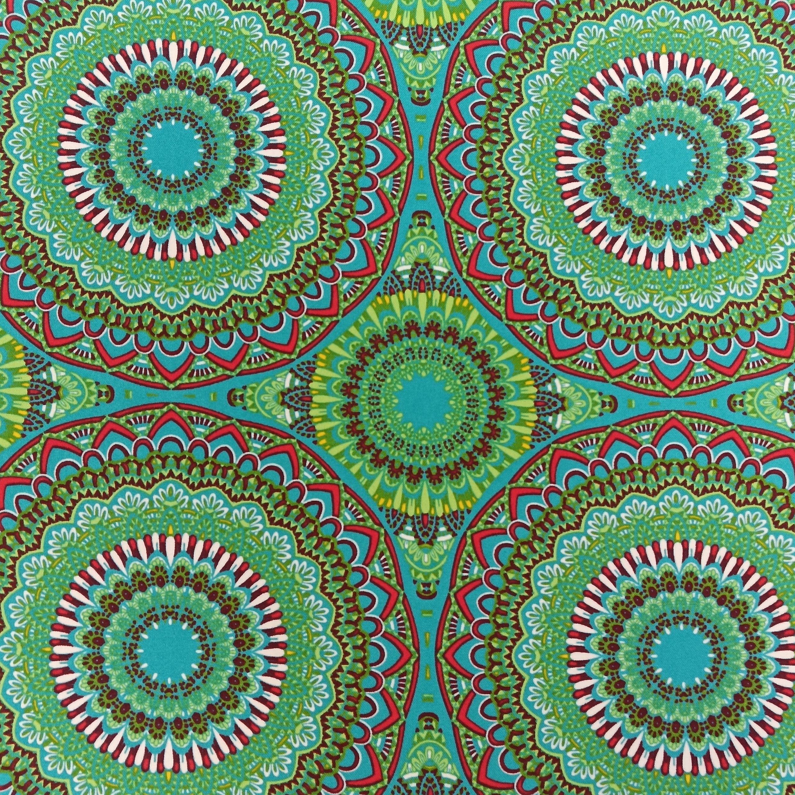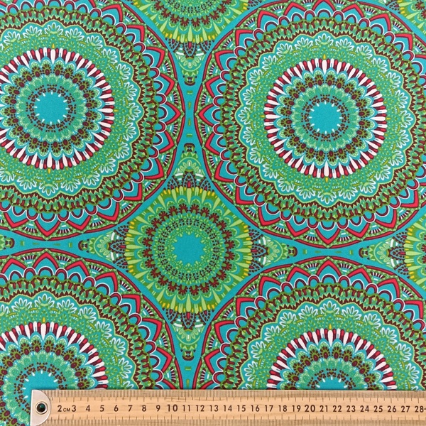 Tejido stretch con estampado de mandalas de estilo hippie en una alegre combinación de colores amarillo, verde, azul, blanco y rojo. Un diseño llamativo y equilibrado que aporta un toque bohemio y original a cualquier proyecto de confección.